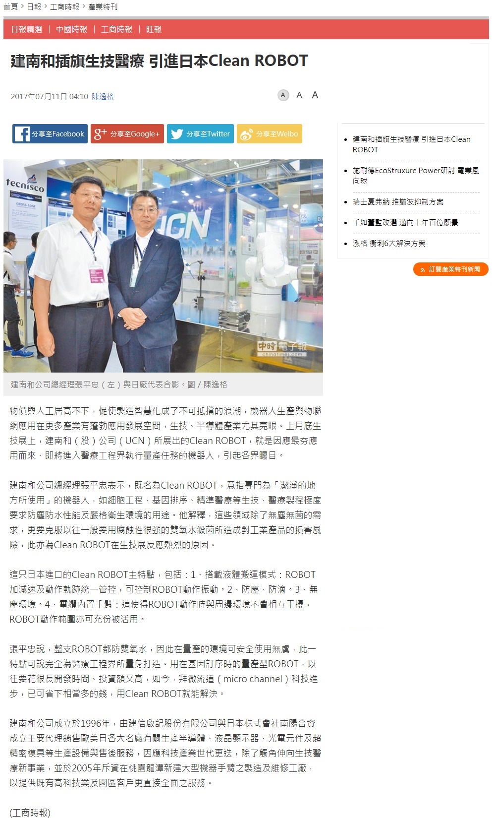 建南和插旗生技醫療 引進日本Clean ROBOT